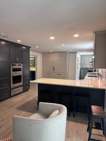 On this remodel the client wanted a big open kitchen. To do so we removed the wall between the kitchen and den area to open up the space. We removed the old pantry closet and built in desk and replaced it with full wall pantry cabinets and drawers with built in wall oven, microwave and warming drawer. Putting the big island was also a must and is the center hub for the family with an extra wide counter top to accommodate extra counter space and seating for four. The back wall which was the desk and lower cabinets was converted into two SubZero built in refrigerators with cabinet panels. Top it all off with new flooring and a beautiful new backsplash, needless to say this is their favorite and most used space in the house.